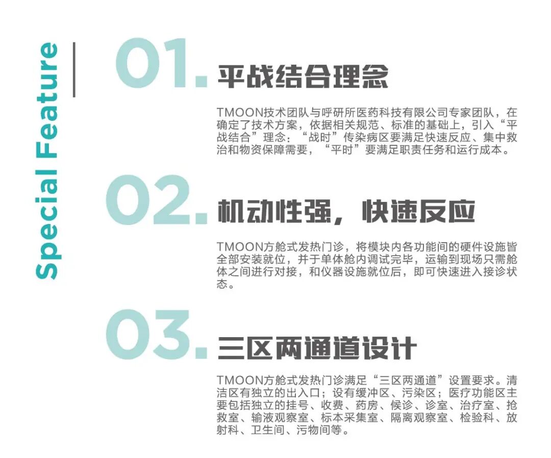 现阶段加快适应新冠疫情常态化防控要求,继续加大力度实施检测策略,加强医疗机构院感防控手段,TMOON&博锐科技技术团队与呼研所医药科技有限公司团队,在短的时间内确认了技术方案,依据相关规范、标准的基础上,研制了用于医疗机构感染防控工作的新产品 —— 方舱式发热门诊。